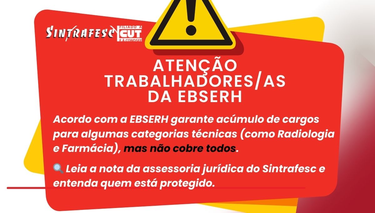 A EBSERH firmou um acordo extrajudicial que garante a manutenção dos vínculos de alguns profissionais da saúde que acumulam cargos públicos. No entanto, o Sintrafesc, por meio de sua assessoria jurídica SLPG Advogados, alerta: a medida não contempla todos os casos, e muitos trabalhadores ainda dependem da Ação Civil Pública movida pelo sindicato.