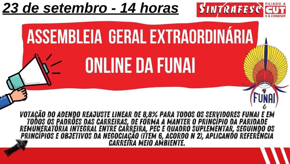 O presidente do Sindicato dos Trabalhadores no Serviço Público Federal no Estado de Santa Catarina – Sintrafesc, Dérmio Antônio Filippi, no uso das suas atribuições estatutárias (Art. 11), convoca a categoria dos(as) Servidores(as) Públicos da FUNAI lotados em Santa Catarina para participarem da ASSEMBLEIA GERAL EXTRAORDINÁRIA, que será realizada pela plataforma virtual Zoom, no dia 23 de setembro de 2024, às 14 horas, em primeira convocação e abertura da sala virtual, com a maioria dos presentes, e às 14h15min, em segunda e última convocação, com qualquer número de presentes, para deliberar sobre a seguinte pauta: