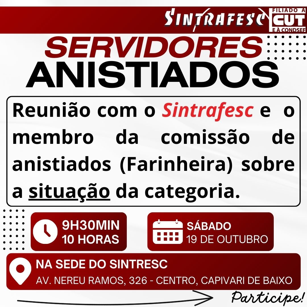 O Sintrafesc realizará uma reunião em Capivari de Baixo no próximo sábado, 19 de outubro, às 9h30, para discutir a situação dos servidores anistiados. O encontro será na sede do Sintresc, localizada na Av. Nereu Ramos, 326 - Centro, Capivari de Baixo. A reunião contará com a presença do membro da comissão dos servidores anistiados e filiado ao Sintrafesc, Farinheira, e será uma oportunidade fundamental para debater os desafios atuais e fortalecer a mobilização em torno da luta pelos direitos da categoria.