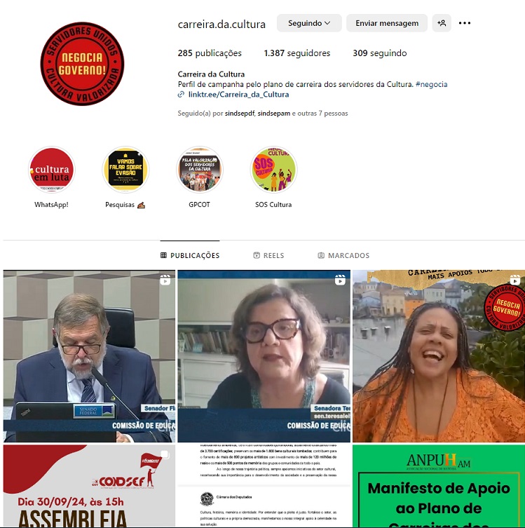 Diversas entidades também reforçam e fortalecem a luta que cobra do MGI a abertura de negociações para a criação de uma carreira para a Cultura. A categoria já recebeu apoio da Abrafin (Associação Brasileira de Festivais Independentes), do Icomos Brasil (Conselho Internacional de Monumentos e Sítios), ligado à Unesco, do Conselho Consultivo do Patrimônio Cultural, da Sociedade Brasileira para o Progresso da Ciência (SBPC), do Fórum de Entidades em Defesa do Patrimônio Cultural Brasileiro, da Federação Nacional de Arquitetos e Urbanista (FNA), da Associação Brasileira da Música Independente (ABMI), da Rede de Educadores em Museus do Brasil (REM-Br), Associação Nacional de História (ANPUH-AM), Sociedade de Arqueologia Brasileira, Superintendencia de Museus do Estado do Rio de Janeiro, Palmares - Centro de Estudos e Assessoria por Direitos, Associação Cultural de Amigos do Museu de Folclore Edison Carneiro.