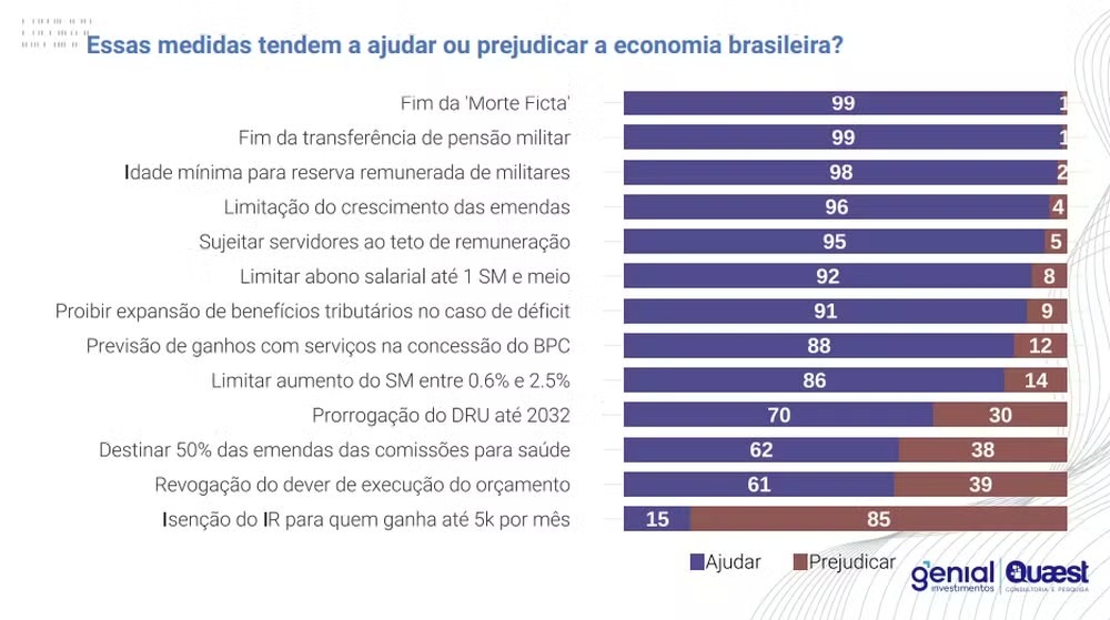 Já uma pesquisa da Genial Quaest, divulgada nesta quarta-feira (4), sobre a avaliação do mercado financeiro ao pacote apresentado pelo governo Lula para equilibrar as contas públicas, confirma que os especuladores e rentistas querem colocar nas costas do povo trabalhador e pobre a conta pelo “déficit fiscal” para que eles obtenham mais lucros e o país siga sendo desigual economicamente e socialmente.