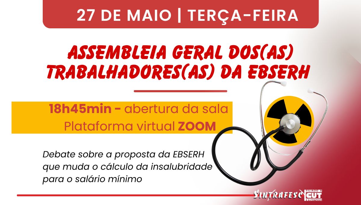 O Sintrafesc – Sindicato dos Trabalhadores no Serviço Público Federal no Estado de Santa Catarina, CNPJ nº 80.673.981/0001-77, convoca todos os empregados da Empresa Brasileira de Serviços Hospitalares – EBSERH, lotados no Estado de Santa Catarina, que recebem adicional de insalubridade, para participarem da Assembleia Geral Extraordinária, na modalidade virtual, em observância às medidas sanitárias para evitar aglomerações e manter o distanciamento social, a ser realizada no dia 27 de maio de 2025, às 18h45 em primeira convocação e às 19h00 em segunda convocação, com qualquer número de presentes, na plataforma Zoom, pelo link: https://us02web.zoom.us/j/88606280689?pwd=4Tqb7L7iUjdep6aJDnK5tJy1nuNCvY.1 (ID da reunião: 886 0628 0689 | Senha: 347795). A assembleia ocorre em conformidade com o Comunicado Conjunto divulgado em 21/05/2025 pelas entidades nacionais CONDSEF, CNTS, FNE, FMB, FENAM e FENAFAR, para discutir e deliberar sobre a seguinte ordem do dia: