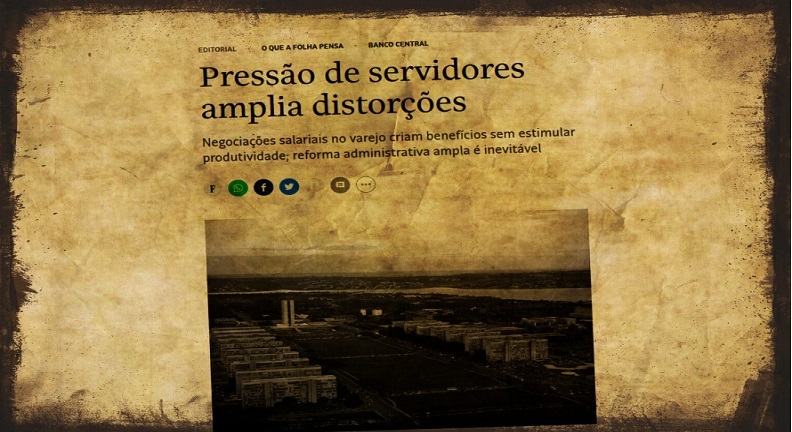 Em editorial de domingo, 18, intitulado “Pressão de servidores amplia distorções”, a Folha de S. Paulo afirma que a “uma ampla reforma administrativa” é necessária e reduz as reivindicações das categorias a meras “pressões corporativistas”. Entre outros pontos, o jornal defende ganhos por produtividade e que adicionais não sejam estendidos a aposentados e aposentadas e confunde os leitores ao misturar reivindicações de servidores e servidoras com benefícios autoconcedidos pela magistratura.